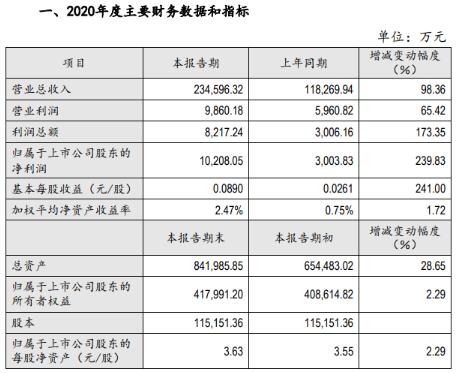 公司2020年實(shí)現(xiàn)營業(yè)總收入234,596.32萬元,較上年同期增長98.36%;利潤總額8,217.24萬元,較上年同期增長173.35%;歸屬于上市公司股東的凈利潤10,208.05萬元,較上年同期增長239.83%;基本每股收益0.0890元/股,較上年同期增加241.00%。