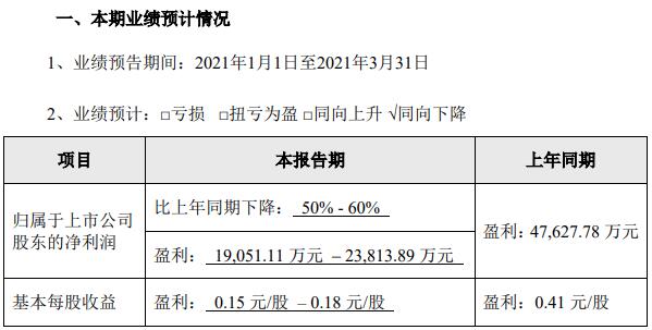 天邦股份4月15日發(fā)布2021年一季度業(yè)績預告,預計2021年第一季度歸屬于上市公司股東的凈利潤約1.91億元~2.38億元,同比下降50%~60%;基本每股收益盈利0.15元~0.18元。