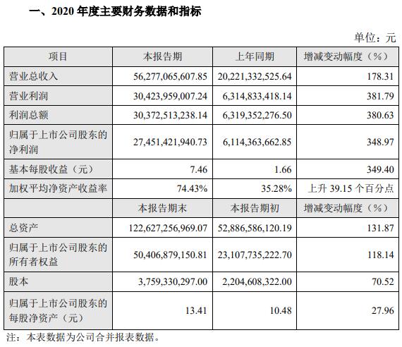 報(bào)告期內(nèi),公司實(shí)現(xiàn)營業(yè)總收入5,627,706.56萬元,比上年同期增加178.31%;實(shí)現(xiàn)歸屬于上市公司股東的凈利潤2,745,142.19萬元,比上年同期增加348.97%。
