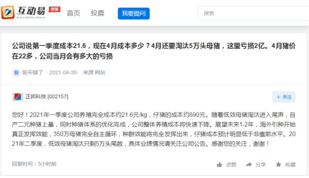 正邦科技今日在回復(fù)投資者提問時(shí)表示,2021年一季度公司養(yǎng)殖完全成本約21.6元/kg,仔豬的成本約890元。隨著低效母豬淘汰進(jìn)入尾聲,自產(chǎn)二元種豬上量,同時(shí)種豬體系的優(yōu)化完成,公司整體養(yǎng)殖成本將快速下降。展望未來1-2年,海外引種開始真正發(fā)揮效能,350萬母豬完全自主循環(huán),種群效能將完全發(fā)揮出來,仔豬成本預(yù)計(jì)明顯低于非瘟前水平。2021年二季度,低效母豬淘汰只剩5萬頭尾數(shù),具體業(yè)績情況請關(guān)注公司公告。