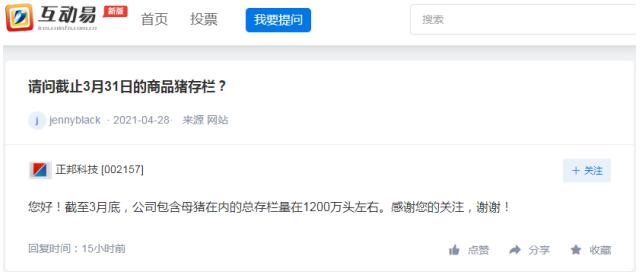 正邦科技5日在回復(fù)投資者提問(wèn)時(shí)表示,截至3月底,公司包含母豬在內(nèi)的總存欄量在1200萬(wàn)頭左右。
