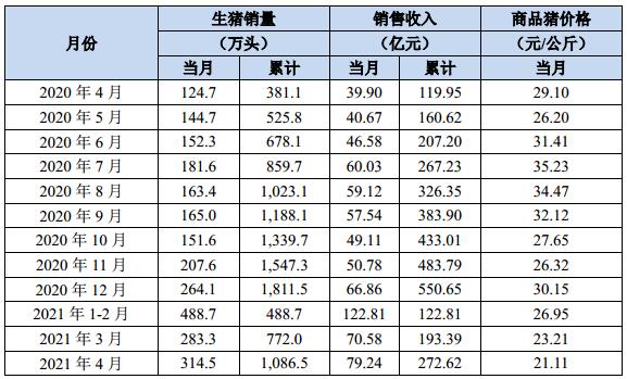牧原股份5月7日公布2021年4月份生豬銷售簡報。2021年4月份,公司銷售生豬314.5萬頭,銷售收入79.24億元。其中向全資子公司牧原肉食品有限公司及其子公司合計銷售生豬18.8萬頭。