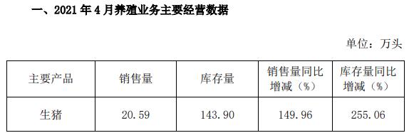 2021年1-4月,公司累計銷售生豬74.05萬頭,銷售量同比增長170.19%。