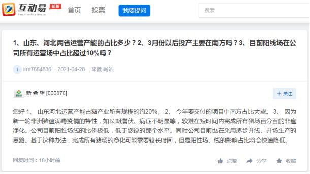 新希望:山東河北運(yùn)營產(chǎn)能占豬產(chǎn)業(yè)所有規(guī)模的約20%