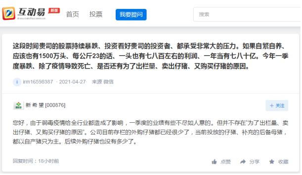 5月10日,新希望在回復(fù)投資者提問時(shí)表示,由于弱毒疫情給全行業(yè)都造成了影響,一季度的業(yè)績有些不盡如人意的。但并不存在“為了出欄量、賣出仔豬、又購買仔豬的原因”。