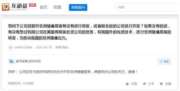 金河生物今日在回復(fù)投資者提問時(shí)表示,公司正在與相關(guān)科研機(jī)構(gòu)合作開發(fā)非洲豬瘟疫苗。