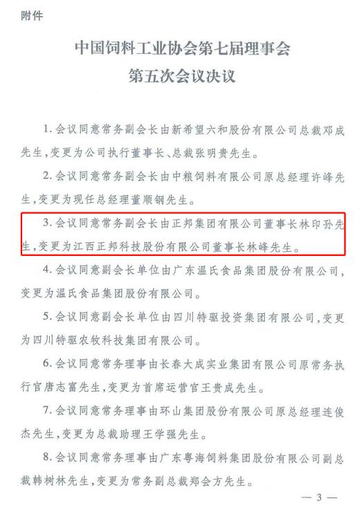 根據(jù)《中國飼料工業(yè)協(xié)會章程》規(guī)定,中國飼料工業(yè)協(xié)會于4月17日召開了第七屆理事會第五次會議。會議表決通過了部分常務(wù)副會長、副會長、常務(wù)理事、理事變更和增補副會長單位,中國飼料工業(yè)協(xié)會關(guān)于提請審議專業(yè)委員會調(diào)整、辦公地址變更、下設(shè)辦事機構(gòu)和副秘書長人選提名等議案。近日,第七屆理事會第五次會議決議對外公布,正邦科技董事長林峰當(dāng)選中國飼料工業(yè)協(xié)會常務(wù)副會長。