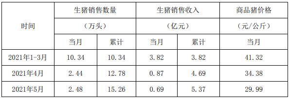2021年5月份,公司商品豬銷售均價29.99元/公斤,其中:供港活大豬均價31.34元/公斤、內(nèi)銷商品肉豬均價19.29元/公斤。
