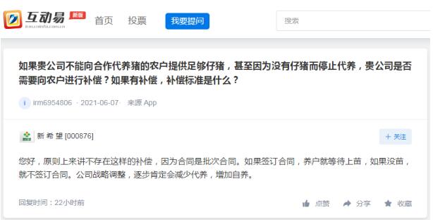 近日,有投資者在互動平臺上提問:如果貴公司不能向合作代養(yǎng)豬的農(nóng)戶提供足夠仔豬,甚至因為沒有仔豬而停止代養(yǎng),貴公司是否需要向農(nóng)戶進(jìn)行補(bǔ)償?如果有補(bǔ)償,補(bǔ)償標(biāo)準(zhǔn)是什么?