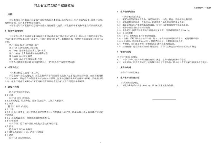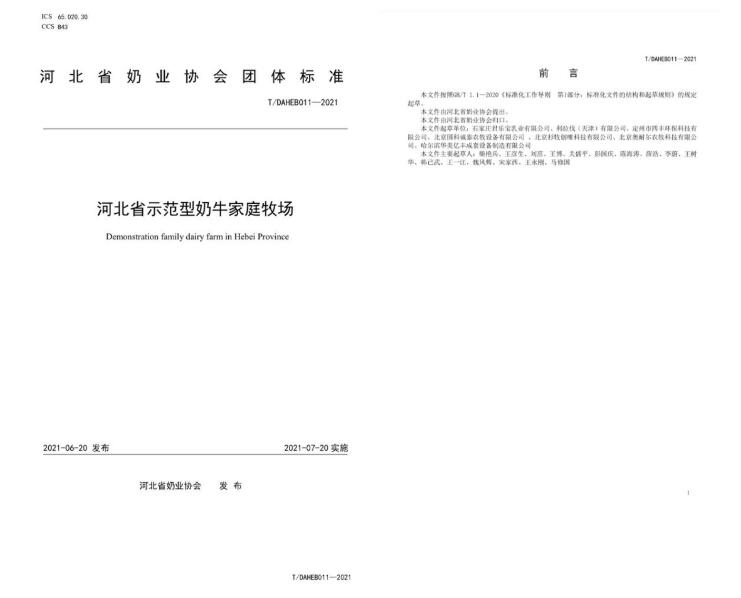 在經(jīng)過資料收集、分析對比、實地調(diào)查等一系列前期準備工作,后期多次組織專家組聽取了標準起草組的標準編制情況說明,對團體標準進行逐章、逐條審查和討論,提出意見與建議,并針對性進行修改與調(diào)整,征得專家組一致同意該標準通過審查,歷經(jīng)近1年的努力,形成部分標準征求意見稿,最終正式對外發(fā)布《河北省示范型奶牛家庭牧場》團體標準。