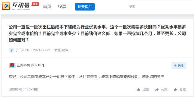 正邦科技近日在回復(fù)投資者提問(wèn)時(shí)表示,公司二季度成本已處于明顯下降中,從目前來(lái)看,成本下降幅度略超預(yù)期。