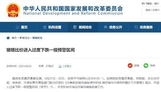 據(jù)國(guó)家發(fā)展改革委監(jiān)測(cè),6月21日~25日,全國(guó)平均豬糧比價(jià)為4.90∶1。按照國(guó)家發(fā)展改革委、財(cái)政部、農(nóng)業(yè)農(nóng)村部、商務(wù)部、市場(chǎng)監(jiān)管總局等部門聯(lián)合印發(fā)的《完善政府豬肉儲(chǔ)備調(diào)節(jié)機(jī)制做好豬肉市場(chǎng)保供穩(wěn)價(jià)工作預(yù)案》規(guī)定,已進(jìn)入過度下跌一級(jí)預(yù)警區(qū)間(低于5∶1),中央和地方將啟動(dòng)豬肉儲(chǔ)備收儲(chǔ)工作。