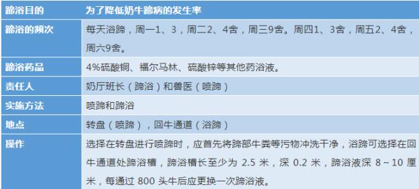 (泌乳、非泌乳)定期蹄浴,實施蹄浴制度,確保奶牛進行有效蹄浴,蹄浴可用于治療、控制和預(yù)防蹄腐爛、趾間和皮炎。蹄浴液的深度以淹沒奶牛的蹄部為宜(9~12cm),藥浴前一定要先洗凈牛蹄,藥浴液濃度4%硫酸銅和4%福爾馬林溶液,及時更換藥浴液,將溶液的pH值控制在4左右,要求每池藥浴液只能藥浴500~800頭。環(huán)境低于13℃時福爾馬林蹄浴不起作用。如果蹄冠部出現(xiàn)被毛豎立或皮膚出現(xiàn)燒灼狀態(tài),停止使用福爾馬林蹄浴。硫酸銅需要用熱水先溶解再配比。圍產(chǎn)、干奶牛、青牛牛(10月齡以上)堅持每周浴蹄一次,方法是使用每棟舍通道處的蹄浴槽,有專人負(fù)責(zé)藥浴液配比,記錄等工作。我場泌乳牛的蹄浴槽設(shè)在回牛通道處,每天堅持浴蹄,上午5:30-11:00浴蹄800頭。
