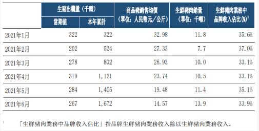 中糧家佳康7月9日公布6月運(yùn)營(yíng)快報(bào)。公司6月生豬出欄量26.7萬頭,本年累計(jì)生豬出欄量167.2萬頭;生鮮豬肉銷量13.9千噸,商品豬銷售均價(jià)人民幣14.57元/公斤,生鮮豬肉業(yè)務(wù)中品牌收入占比為33.9%。