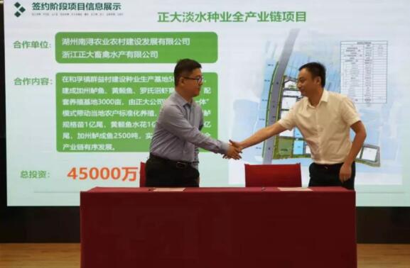 湖州市南潯區(qū)副區(qū)長(zhǎng)秦勝在致辭中表示,對(duì)正大集團(tuán)等企業(yè)的投資表示歡迎,并表示會(huì)為企業(yè)提供良好的投資環(huán)境,也希望新項(xiàng)目能夠加快進(jìn)度,快速落地。正大集團(tuán)農(nóng)牧食品企業(yè)中國(guó)區(qū)副董事長(zhǎng)王慶軍則表示,此次正大集團(tuán)與南潯區(qū)政府?dāng)y手共建淡水種業(yè)及配套養(yǎng)殖全產(chǎn)業(yè)鏈項(xiàng)目,不僅是看中了南潯源遠(yuǎn)流長(zhǎng)的漁業(yè)文化、基礎(chǔ)雄厚的漁業(yè)產(chǎn)業(yè),得天獨(dú)厚的區(qū)位優(yōu)勢(shì),更是想通過項(xiàng)目共建,打造高效漁業(yè)、綠色漁業(yè),真正推動(dòng)湖州、浙江乃至長(zhǎng)三角地區(qū)的漁業(yè)發(fā)展與轉(zhuǎn)型升級(jí)。此次項(xiàng)目將采用“五位一體”合作模式,即:正大+政府+銀行+村集體+農(nóng)戶,力爭(zhēng)共同打造國(guó)內(nèi)一流的淡水種業(yè)及配套養(yǎng)殖園區(qū),推動(dòng)長(zhǎng)三角水產(chǎn)養(yǎng)殖的發(fā)展。項(xiàng)目將在帶動(dòng)農(nóng)民增產(chǎn)增收,促進(jìn)地方經(jīng)濟(jì)高質(zhì)量發(fā)展、提高先進(jìn)工藝與設(shè)施實(shí)現(xiàn)生態(tài)水產(chǎn)養(yǎng)殖、推動(dòng)行業(yè)的全產(chǎn)業(yè)鏈發(fā)展、促進(jìn)行業(yè)數(shù)字化改革與轉(zhuǎn)型升級(jí)等方面發(fā)揮顯著作用。