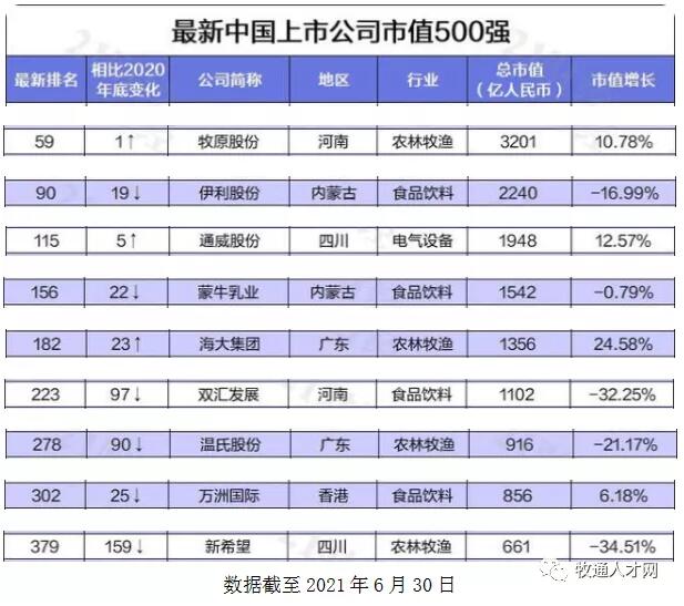 最新上市公司市值500強的門檻是417億元,農(nóng)林牧漁板塊只有4家企業(yè)躋身其中,分別是:第59位的牧原股份(3201億元);第182位的海大集團(1356億元)、第278位的溫氏股份(916億元)、第379位的新希望(661億元)。