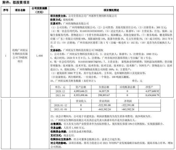 根據(jù)公司飼料產(chǎn)業(yè)發(fā)展規(guī)劃和供應鏈業(yè)務發(fā)展需求,公司擬收購廣州欣辰生物科技有限公司70%股權,經(jīng)協(xié)商本次收購對價為1,600萬元。欣辰生物合法擁有以下資產(chǎn):