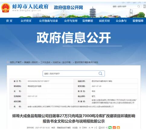 7月20日,安徽省蚌埠市政府發(fā)布公告稱,蚌埠大成食品有限公司擬投資65000萬元位于安徽省蚌埠市固鎮(zhèn)縣經(jīng)一路東側(cè)與劉集路交叉口的空地新建廠房,實施“日屠宰27萬只肉雞及7000噸冷庫擴(kuò)改建項目(根據(jù)小編計算,如果滿負(fù)荷生產(chǎn),年屠宰肉雞近1億只)”。
