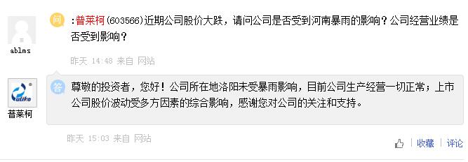 普萊柯:公司所在地洛陽未受暴雨影響,目前公司生產(chǎn)經(jīng)營(yíng)一切正常
