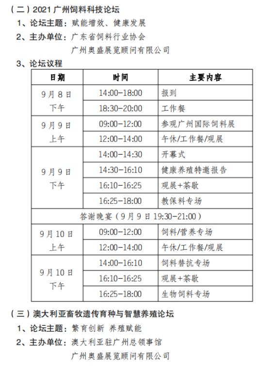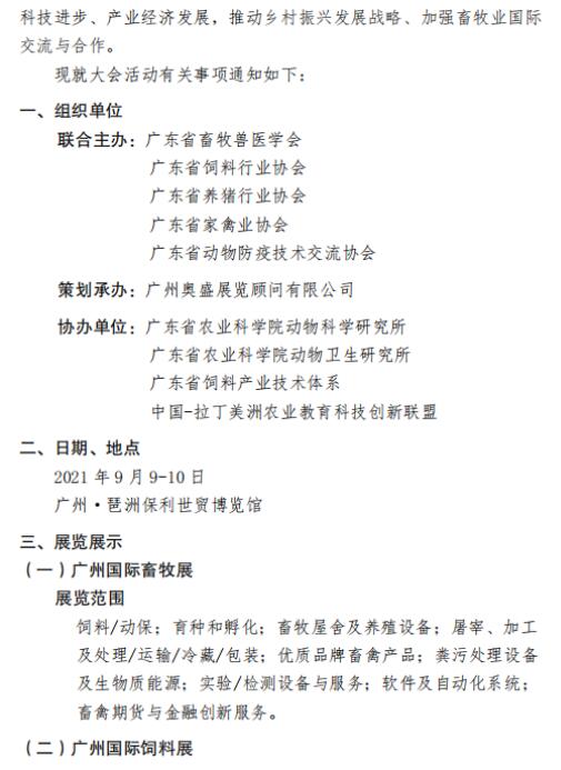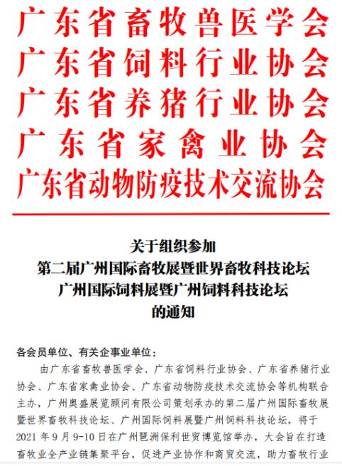 由廣東省畜牧獸醫(yī)學(xué)會、廣東省飼料行業(yè)協(xié)會、廣東省養(yǎng)豬行業(yè)協(xié)會、廣東省家禽業(yè)協(xié)會、廣東省動物防疫技術(shù)交流協(xié)會等機(jī)構(gòu)聯(lián)合主辦,廣州奧盛展覽顧問有限公司策劃承辦的第二屆廣州國際畜牧展暨世界畜牧科技論壇、廣州國際飼料展暨廣州飼料科技論壇,將于2021年9月9-10日在廣州·琶洲保利世貿(mào)博覽館舉辦,大會旨在打造畜牧業(yè)全產(chǎn)業(yè)鏈集聚平臺,促進(jìn)產(chǎn)業(yè)協(xié)作和商貿(mào)交流,助力畜牧行業(yè)科技進(jìn)步、產(chǎn)業(yè)經(jīng)濟(jì)發(fā)展,推動鄉(xiāng)村振興發(fā)展戰(zhàn)略、加強(qiáng)畜牧業(yè)國際交流與合作。