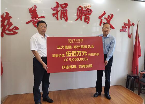 2021年7月22日上午,正大集團(tuán)通過正大慈善基金會向鄭州慈善總會捐贈價值500萬元救災(zāi)物資,正大集團(tuán)農(nóng)牧食品企業(yè)中國區(qū)副董事長王鴻章、鄭州慈善總會會長姚待獻(xiàn)、鄭州慈善總會黨支部書記周培功等參加捐贈儀式。