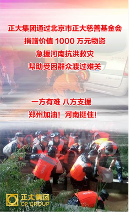 為支持河南受災(zāi)地區(qū)抗擊洪澇災(zāi)害,正大集團(tuán)通過正大慈善基金會捐贈價值1000萬元的食品、飲用水和其他生活用品等救災(zāi)物資,定向援助河南省受災(zāi)地區(qū)開展災(zāi)害救援工作。