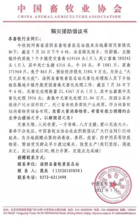 災害無情,人間有愛。一方有難,八方支援,愛心無論大小,善舉不分先后。中國畜牧業(yè)協(xié)會在此積極倡議廣大行業(yè)同仁行動起來,為當地捐贈必要的消毒液、獸藥、疫苗、防護用具等防疫物資,幫助受災群眾早日渡過難關、恢復生產!我們堅信,涓流共匯,足以涌成江河;綿力齊聚,定能眾志成城!