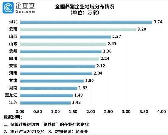 河北成全國養(yǎng)豬大省,云南、山西緊隨其后 地域上,河北省擁有的養(yǎng)豬企業(yè)數(shù)量最多,達3.74萬家。河北省是生豬養(yǎng)殖和調(diào)出大省,存欄量和出欄量連續(xù)多年位居全國前列,是全國重要的生豬生產(chǎn)和供應基地。河北還有個“全國養(yǎng)豬大縣”——安平縣。而云南省和山東省則分別以3.28萬家和2.57萬家養(yǎng)豬企業(yè),排名全國第二、第三。