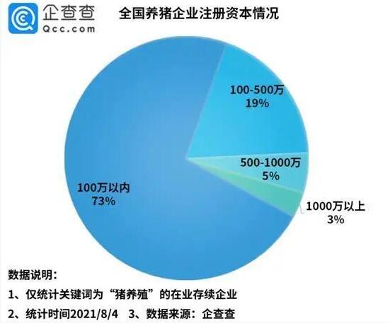 注冊資本上,注冊資本在100萬以內(nèi)的養(yǎng)豬企業(yè)是該市場的主力軍,占據(jù)了總量的73%,而注冊資本在1000萬以上的,僅占3%。