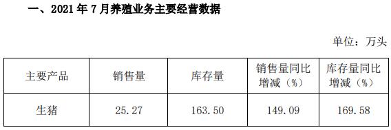 2021年7月,公司生豬銷售量25.27萬(wàn)頭,銷售量環(huán)比增長(zhǎng)12.92%,同比增長(zhǎng)149.09%。