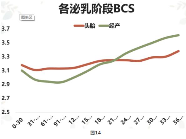 圖14所示為頭胎牛和經(jīng)產(chǎn)牛各個泌乳階段的體況評分數(shù)據(jù)。頭胎牛和經(jīng)產(chǎn)牛飼喂相同的日糧,可以看出,泌乳初期時,經(jīng)產(chǎn)牛失重大于頭胎牛;泌乳高峰階段,頭胎牛體況優(yōu)于經(jīng)產(chǎn)牛;泌乳末期,經(jīng)產(chǎn)牛體況優(yōu)于頭胎牛,停奶時體況評分3.5左右,因為泌乳末期頭胎牛產(chǎn)量比經(jīng)產(chǎn)牛略高,頭胎牛在第一個泌乳期攝入的部分營養(yǎng)還要用于自身生長,所以末期時體況不如經(jīng)產(chǎn)牛,停奶時體況評分3.3分左右。
