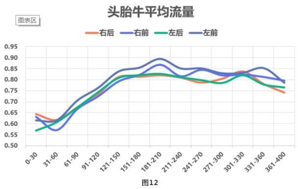 圖12所示為頭胎牛分乳區(qū)分階段的平均流量。頭胎牛在泌乳初期時平均流量較低,可能因為頭胎牛第一次進入泌乳階段,還沒完全適應(yīng)擠奶過程,但是隨著產(chǎn)奶量逐漸增加、泌乳天數(shù)逐漸增加的過程,各個乳區(qū)的平均流量也在逐漸增加,能夠達到0.8公斤/分鐘以上,同時可見前乳區(qū)平均流量要高于后乳區(qū)。
