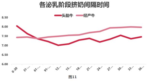 擠奶間隔時間正好和產(chǎn)奶量呈現(xiàn)相反趨勢。頭胎牛擠奶次數(shù)要高于經(jīng)產(chǎn)牛,所以擠奶間隔時間頭胎牛要少于經(jīng)產(chǎn)牛。如圖11所示,經(jīng)產(chǎn)牛平均擠奶間隔7.59小時,頭胎牛平均擠奶間隔7.31小時。