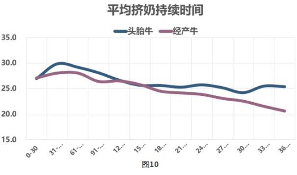 平均擠奶持續(xù)時間指全年每天平均擠奶持續(xù)時間。如圖10所示,從整個泌乳期來看,頭胎牛和經(jīng)產(chǎn)牛擠奶持續(xù)時間基本和產(chǎn)奶量變化趨勢相一致,產(chǎn)奶量越高,擠奶持續(xù)時間越長,每日擠奶持續(xù)時間頭胎牛稍長于經(jīng)產(chǎn)牛,因為頭胎牛擠奶次數(shù)要高于經(jīng)產(chǎn)牛;但是經(jīng)產(chǎn)牛在高峰階段持續(xù)時間反而沒有頭胎牛高。泌乳末期時,頭胎牛產(chǎn)量能達到35公斤,經(jīng)產(chǎn)牛只有30公斤,頭胎牛產(chǎn)量更高所以它的擠奶持續(xù)時間越長。