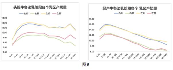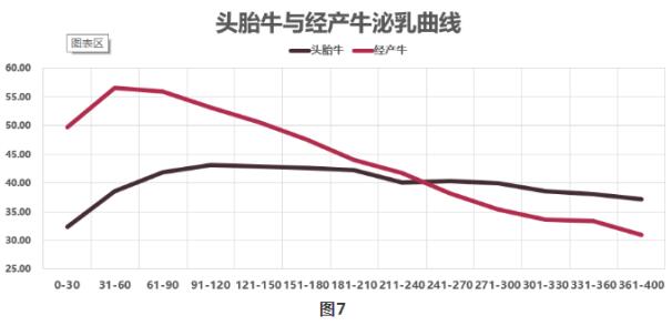 圖7所示為頭胎牛與經(jīng)產(chǎn)牛泌乳曲線。一般情況下,頭胎牛沒有經(jīng)產(chǎn)牛高峰奶高,但是泌乳末期后,頭胎牛的泌乳持續(xù)性要好一些,到泌乳末期時,產(chǎn)奶量會高于經(jīng)產(chǎn)牛。停奶時,經(jīng)產(chǎn)牛產(chǎn)奶量可達到30公斤以上,頭胎??蛇_到35公斤以上。