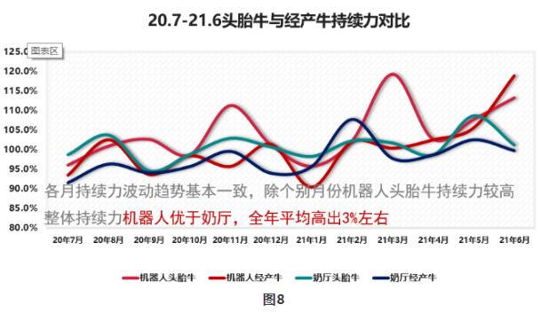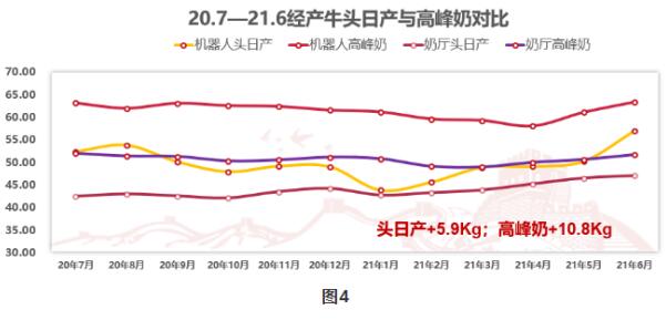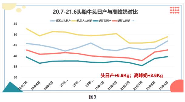 從2020年7月份開始,良種場奶廳每天實現(xiàn)四班擠奶,機器人平均每天擠奶次數(shù)3.3次左右。從圖3產(chǎn)量走勢可明顯看出,機器人擠奶頭日產(chǎn)和高峰奶兩條線基本在奶廳擠奶兩條線之上。頭胎牛頭日產(chǎn)增加6.6公斤/天左右,高峰奶增加8.6公斤/天左右。