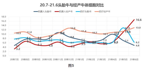 通過頭胎牛與經(jīng)產(chǎn)牛體細胞數(shù)對比,如圖5所示,除了5、6月份機器人擠奶個別牛體細胞數(shù)過高,從其它月份來看,不管頭胎牛還是經(jīng)產(chǎn)牛,機器人擠奶的體細胞數(shù)相對奶廳擠奶更低一些。表明機器人擠奶能夠給奶牛帶來更好的乳房健康程度。