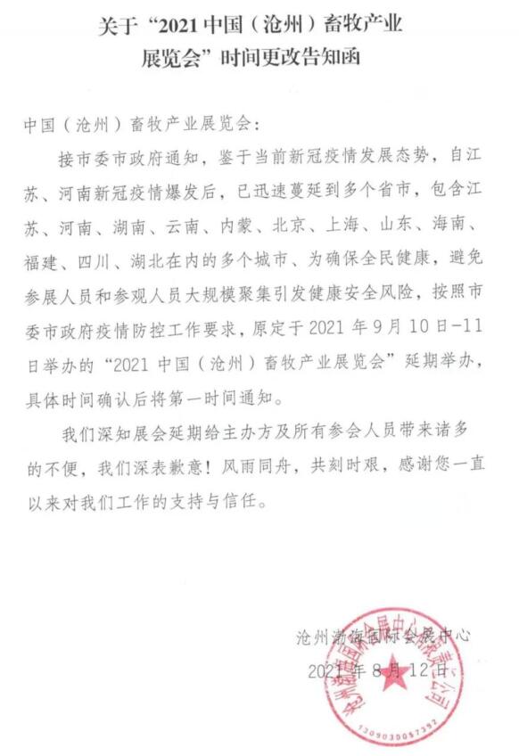 接市委市政府通知,鑒于當前新冠疫情發(fā)展態(tài)勢,自江蘇、河南新冠疫情爆發(fā)后,已迅速蔓延到多個省市,包含江蘇、河南、湖南、云南、內(nèi)蒙、北京、上海、山東、海南、福建、四川、湖北在內(nèi)的多個城市、為確保全民健康,避免參展人員和參觀人員大規(guī)模聚集引發(fā)健康安全風險,按照市委市政府疫情防控工作要求,原定于2021年9月10日-11日舉辦的“2021中國(滄州)畜牧產(chǎn)業(yè)展覽會”延期舉辦,具體時間確認后將第一時間通知。
