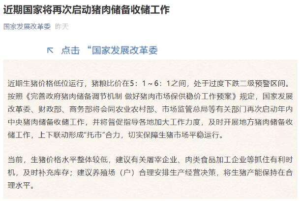近期生豬價(jià)格低位運(yùn)行,豬糧比價(jià)在5:1~6:1之間,處于過度下跌二級(jí)預(yù)警區(qū)間。按照《完善政府豬肉儲(chǔ)備調(diào)節(jié)機(jī)制 做好豬肉市場(chǎng)保供穩(wěn)價(jià)工作預(yù)案》規(guī)定,國(guó)家發(fā)展改革委、財(cái)政部、商務(wù)部將會(huì)同農(nóng)業(yè)農(nóng)村部、市場(chǎng)監(jiān)管總局等有關(guān)部門再次啟動(dòng)年內(nèi)中央豬肉儲(chǔ)備收儲(chǔ)工作,并將督促指導(dǎo)各地加大工作力度,及時(shí)開展地方豬肉儲(chǔ)備收儲(chǔ)工作,上下聯(lián)動(dòng)形成“托市”合力,切實(shí)保障生豬市場(chǎng)平穩(wěn)運(yùn)行。