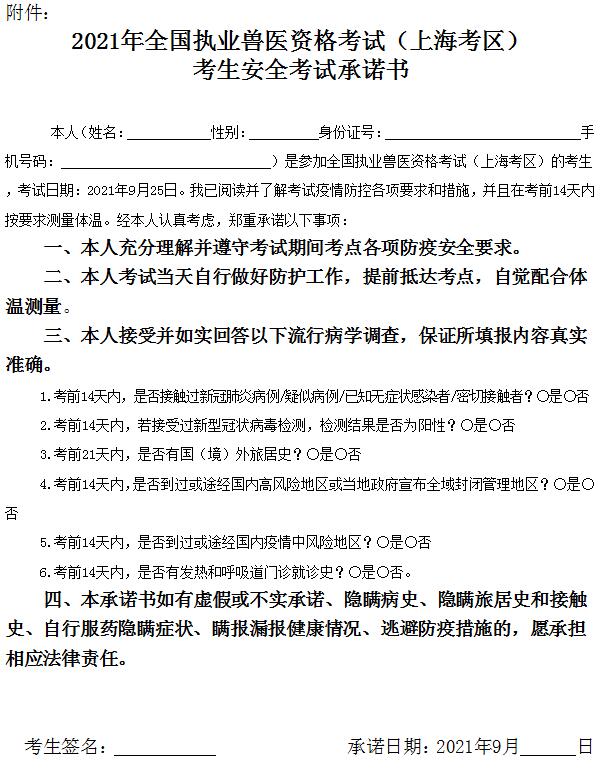 (五)考試前,所有考生須要自行到吉林省畜牧業(yè)管理局官方網(wǎng)站通知公告欄下載《2021年全國執(zhí)業(yè)獸醫(yī)資格考試疫情防控與誠信考試考生承諾書》(網(wǎng)址:http://xmy.jl.gov.cn/zwgk/),提前打印承諾書并在考生簽字處簽上本人名字。