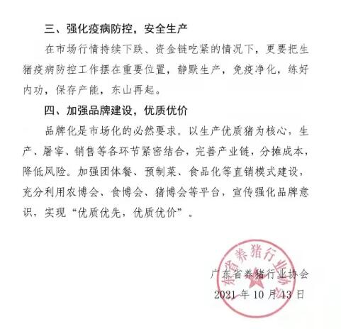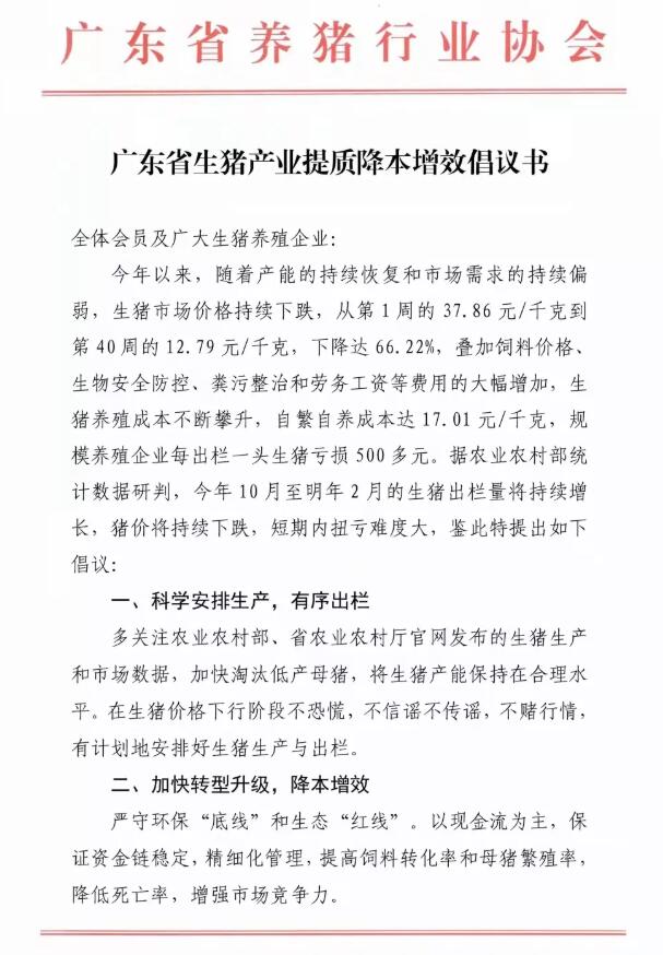 當(dāng)前生豬市場(chǎng)行情整體低迷,短期內(nèi)扭虧難度大。為促進(jìn)產(chǎn)業(yè)健康發(fā)展,保障養(yǎng)戶基本利益,2021年10月13日,廣東省養(yǎng)豬行業(yè)協(xié)會(huì)發(fā)出《廣東省生豬產(chǎn)業(yè)提質(zhì)降本增效倡議書》,提出四點(diǎn)倡議:科學(xué)安排生產(chǎn),有序出欄;加快轉(zhuǎn)型升級(jí),降本增效;強(qiáng)化疫病防控,安全生產(chǎn);加強(qiáng)品牌建設(shè),優(yōu)質(zhì)優(yōu)價(jià)。
