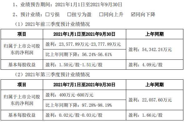 東瑞股份10月15日公布2021年度前三季度業(yè)績預告。預計2021年前三季度歸屬于上市公司股東的凈利潤約2.36-2.38億元,同比下降56.24%~56.61%。預計第三季度凈利潤400-600萬元,同比下降97.28%-98.19%。