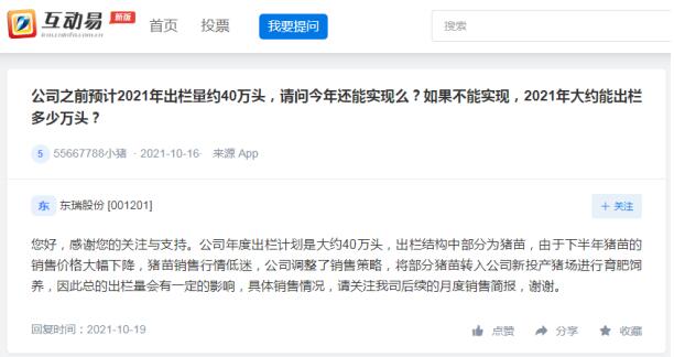 東瑞股份近日在回復(fù)投資者提問時表示,公司年度出欄計劃是大約40萬頭,出欄結(jié)構(gòu)中部分為豬苗,由于下半年豬苗的銷售價格大幅下降,豬苗銷售行情低迷,公司調(diào)整了銷售策略,將部分豬苗轉(zhuǎn)入公司新投產(chǎn)豬場進行育肥飼養(yǎng),因此總的出欄量會有一定的影響,具體銷售情況,請關(guān)注我司后續(xù)的月度銷售簡報。