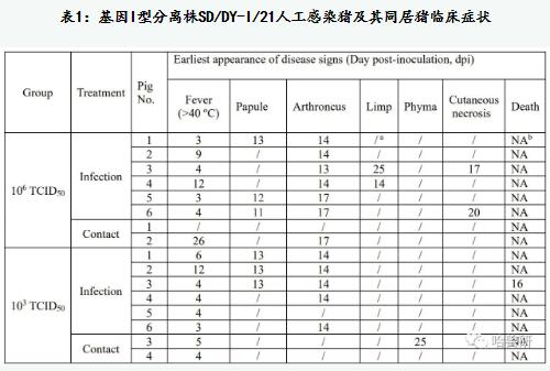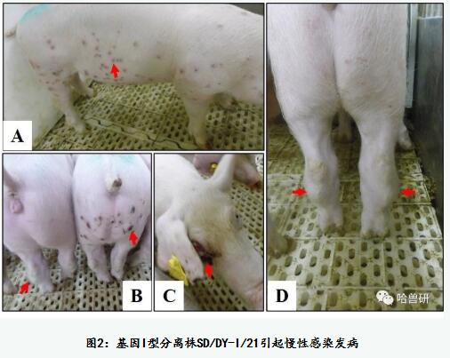動物試驗表明,SD/DY-I/21感染豬表現(xiàn)為低致病力,具有高效傳播能力,可引起壞死性皮膚損傷和關節(jié)腫脹等慢性臨床癥狀(表1和圖2)。以106TCID50劑量感染6頭SPF豬,感染后第3天起陸續(xù)出現(xiàn)不同程度的間歇性發(fā)熱;第11天起3頭豬頸、耳部皮膚出現(xiàn)丘疹并發(fā)展為后腹部和全身性丘疹;第13天陸續(xù)出現(xiàn)關節(jié)炎,其中2頭豬發(fā)展到跛行(表1);感染后第5天起口拭子檢出病毒DNA,第7天起肛拭子與血液中檢出病毒DNA(圖3);感染后28天觀察期內所有豬存活。以103TCID50劑量感染6頭SPF豬,感染后第3天起陸續(xù)出現(xiàn)間歇發(fā)熱,第13天有3頭豬出現(xiàn)皮膚丘疹;第14天陸續(xù)有5頭出現(xiàn)關節(jié)炎;第16天一頭豬發(fā)病死亡,其余28天觀察期內存活(表1);口拭子、肛拭子和血液分別于感染后第9、第11和第7天檢出病毒DNA(圖3);檢測組織中的病毒載量,病死豬顯著高于安樂死存活豬;所有存活豬的組織均檢出病毒DNA,其中脾臟、肺臟、腎上腺、骨髓和某些淋巴結中病毒DNA載量較高。