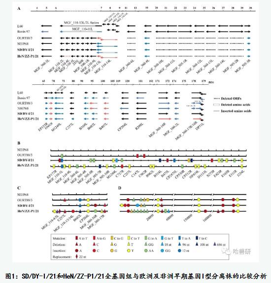 國家非洲豬瘟專業(yè)實驗室科研人員在流行病學監(jiān)測及病原學研究過程中,從山東和河南兩地豬場臨床發(fā)病豬樣品分離出兩株基因 I 型非洲豬瘟病毒SD/DY-I/21和HeN/ZZ-P1/21,兩株病毒均無血吸附活性。全基因組進化分析表明,這兩株病毒與上世紀葡萄牙分離的基因I型低致死毒株NH/P68 和 OURT88/3 高度相似,與歐洲及非洲早期分離的基因I型強毒株L60和Benin 97存在較大差異(圖1)。SD/DY-I/21和HeN/ZZ-P1/21盡管全基因組序列高度相似,但部分基因存在明顯突變差異,提示二者有可能屬于不同的入侵來源(圖1)。NH/P68 于1968年從葡萄牙的一頭具有慢性癥狀的家豬中分離, OURT88/3于1988年從葡萄牙豬場的軟蜱中分離。葡萄牙和西班牙已于九十年代徹底根除非洲豬瘟,目前NH/P68和OURT88/3僅保存于國外少數(shù)幾個實驗室,限于嚴格生物安全條件下開展相關基礎與應用研究。此類病毒通過何種途徑侵入我國,有待進一步了解。