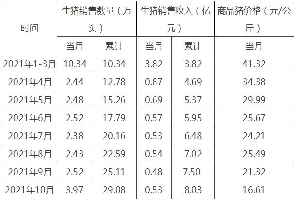 2021年10月份,公司商品豬銷售均價(jià)16.61元/公斤,環(huán)比下降22.08%。