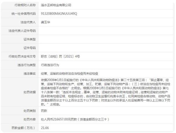 盱眙縣農(nóng)業(yè)農(nóng)村局依據(jù)2008年1月1日起施行的《中華人民共和國動物防疫法》第七十八條第一款:“違反本法規(guī)定,屠宰、經(jīng)營、運輸?shù)膭游镂锤接袡z疫證明,經(jīng)營和運輸?shù)膭游锂a(chǎn)品未附有檢疫證明、檢疫標(biāo)志的,由動物衛(wèi)生監(jiān)督機(jī)構(gòu)責(zé)令改正,處同類檢疫合格動物、動物產(chǎn)品貨值金額百分之十以上百分之五十以下罰款;對貨主以外的承運人處運輸費用一倍以上三倍以下罰款。”之規(guī)定。作出上述罰款處罰。
