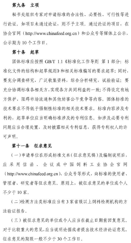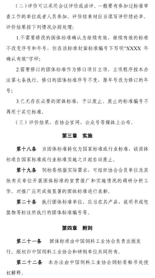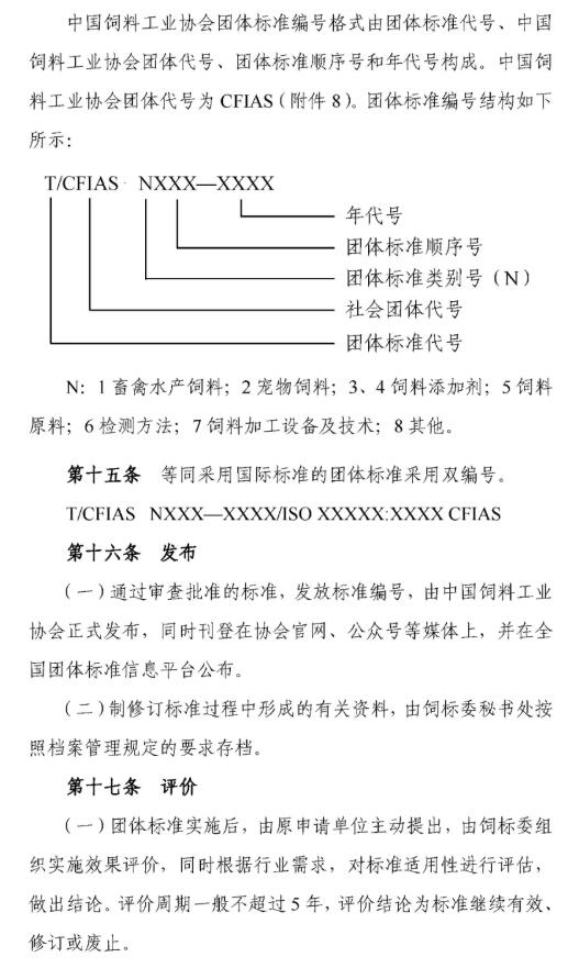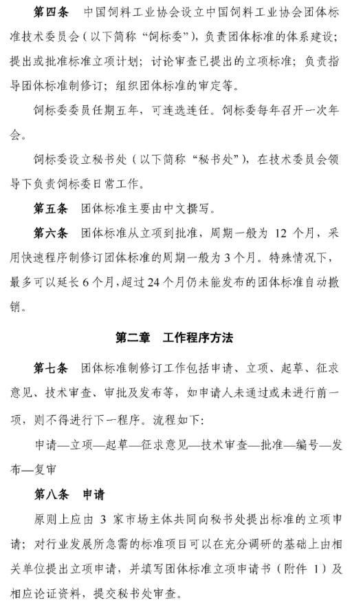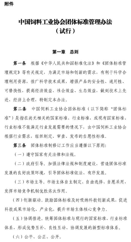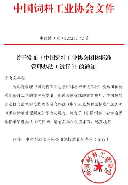 11月8日,中國飼料工業(yè)協(xié)會發(fā)布《中國飼料工業(yè)協(xié)會團體標準管理辦法(試行)》的通知,為規(guī)范管理中國飼料工業(yè)協(xié)會團體標準相關(guān)工作,提高團體標準制修訂工作的效率與質(zhì)量,加強團體標準的宣貫推廣,中國飼料工業(yè)協(xié)會團體標準技術(shù)委員會制定了《中國飼料工業(yè)協(xié)會團體標準管理辦法(試行)》。
