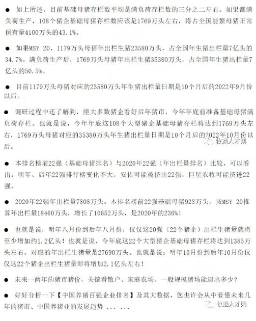 也就是說,今年年底這108個大型豬企基礎(chǔ)母豬存欄將達(dá)到1769萬頭左右,1769萬頭母豬對應(yīng)的35380萬頭年生豬出欄量日期是10個月后的2022年10月份以后。