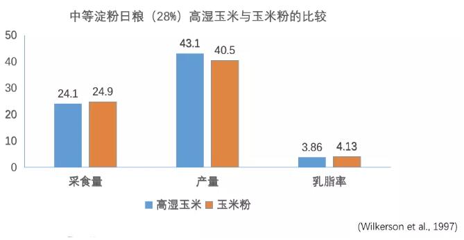 圖10所示為1997年的研究,使用中等淀粉日糧(28%)考察高濕玉米和玉米粉對(duì)采食量、產(chǎn)量及牛奶指標(biāo)(乳脂率)的差異??梢钥闯觯墒沉繘](méi)有明顯下降,分別是24.9kg和24.1kg。但產(chǎn)量顯著提高,使用玉米粉配方產(chǎn)量是40.5kg,換成高濕玉米配方產(chǎn)量達(dá)43.1kg,增加了2.6kg。乳脂率由4.13%下降到3.86%,也不算特別大差異,這個(gè)配方是使用較成功的。因?yàn)榕浞降矸鄄皇翘貏e充足,或者因?yàn)榱鑫缚山到獾矸鄄蛔?,增加高濕玉米替代玉米粉,效果非常好?br>